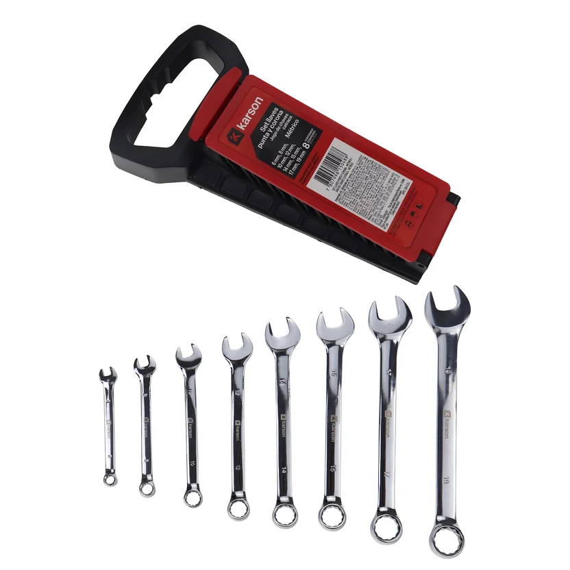 ¡Dale un impulso a tus proyectos con el Juego de 8 llaves combinadas Karson! Este juego incluye tamaños que van desde 6 hasta 19 mm, perfectas para abordar una amplia gama de tareas. Con estas llaves, tendrás la herramienta adecuada para cada trabajo, asegurando un ajuste preciso y eficiente.