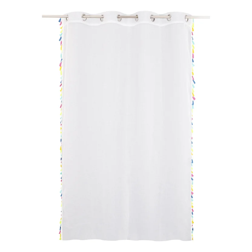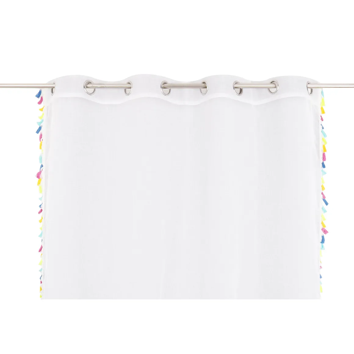 Dale un toque de color y estilo a tu hogar con la Cortina de tela Black Out Tassel. Con sus 140 cm de ancho y 220 cm de alto, esta cortina blanca, con sus atractivos detalles de flecos de colores, es perfecta para cualquier ambiente. Su sistema de colgado con ojales facilita su instalación, brindándote una solución práctica y elegante para controlar la luz y la privacidad de tus espacios.