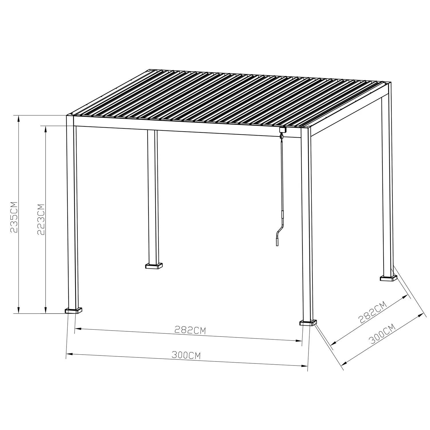 Esta pérgola, fabricada en acero, tiene una forma cuadrada y mide 300 cm de ancho y 300 cm de alto. Requiere armado y cuenta con una estructura resistente. Aunque no es impermeable, su diseño te permitirá disfrutar de tus espacios al aire libre.