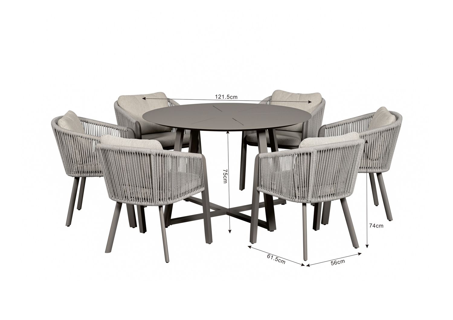 Este juego de comedor de jardín cuenta con 6 sillas con apoyabrazos, y una mesa con dimensiones de 121.5x121.5x75 cm. El juego completo pesa 47.2 kg y requiere armado. Las sillas tienen dimensiones de 56x61.5x74 cm. Fabricado en China, este juego de comedor es ideal para 6 personas.