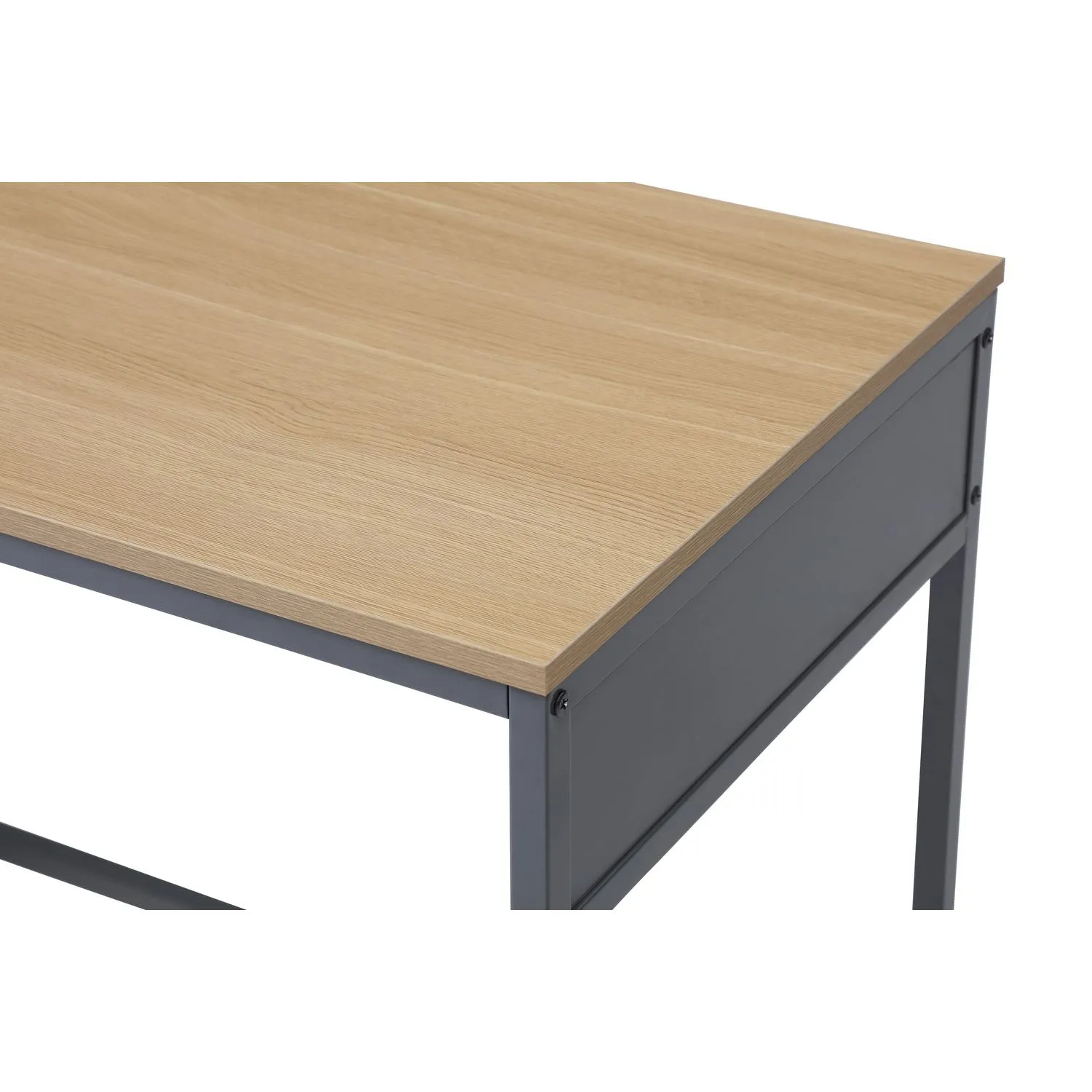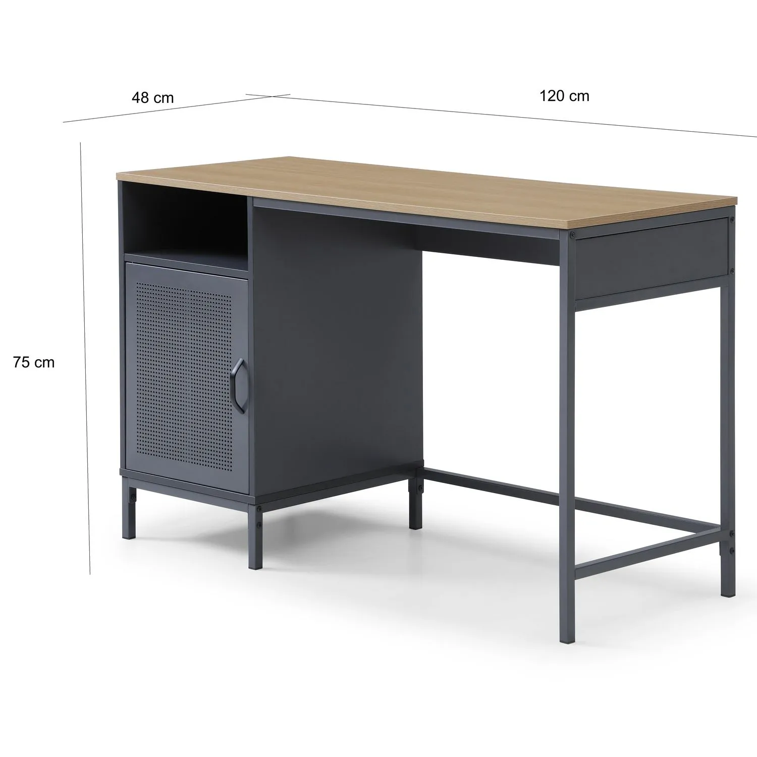 Este escritorio rectangular de Just Home Collection tiene una altura de 75 cm y un ancho de 120 cm, ofreciendo un amplio espacio para tus tareas diarias. Cuenta con una puerta de metal y un cajón para organizar tus pertenencias. Su estructura es de metal, lo que garantiza su durabilidad. El escritorio tiene una profundidad de 48 cm y un peso de 24 kg.
