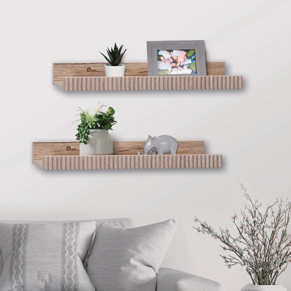¡Dale un toque moderno y funcional a tus espacios con este pack de 2 repisas flotantes! Su diseño en tono natural se adapta a cualquier ambiente, aportando estilo y practicidad. Ideales para exhibir tus objetos decorativos favoritos o mantener todo organizado.