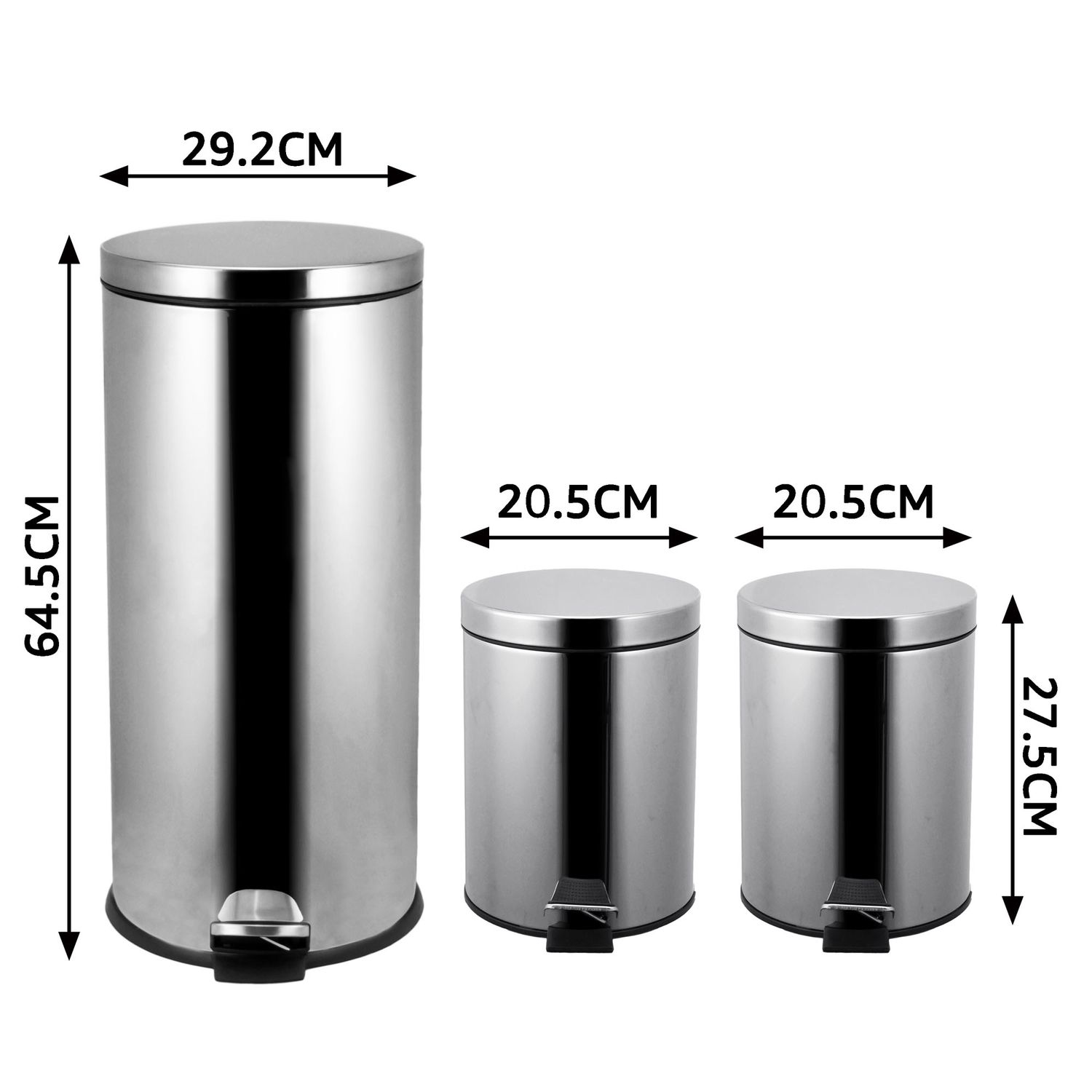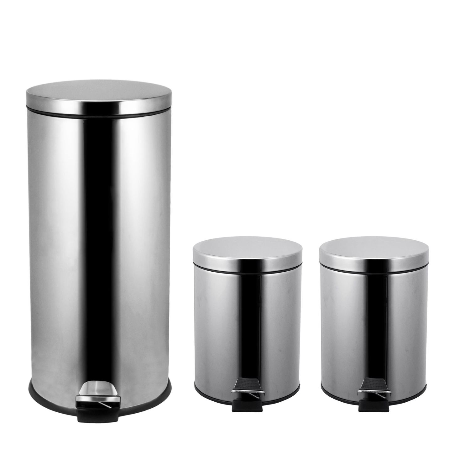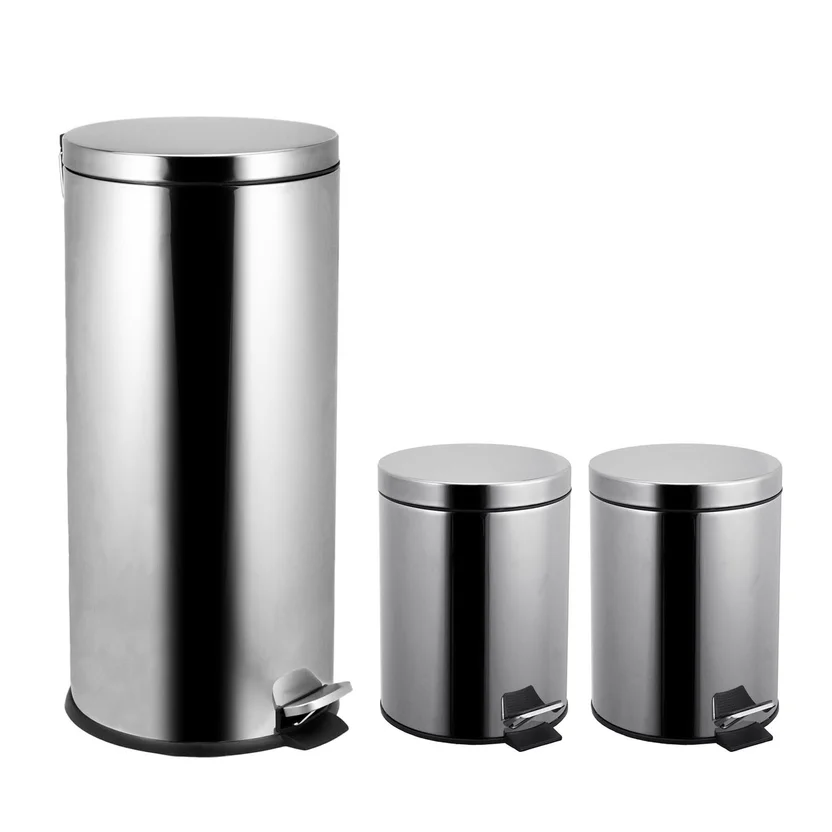 Set de 3 cestos de basura a pedal acero inoxidable 30 L y 2 de 5 L